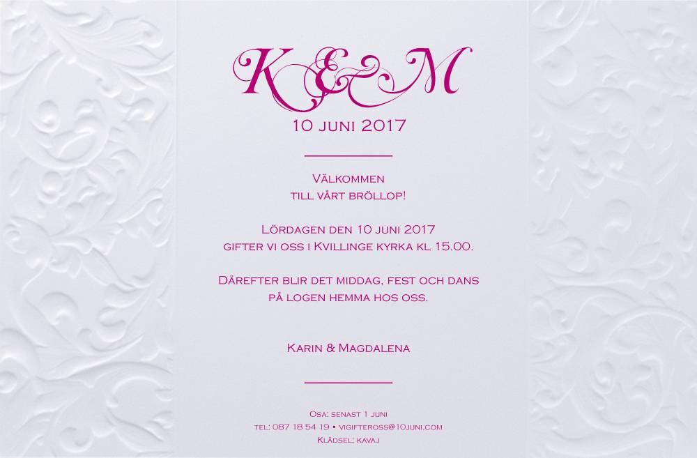 Om du ønsker kan vi montere kortet for deg mot en ekstra kostnad. Sløyfen blir da knytt rundt kortet, og kantene på båndet trimmet.Färg för filter: Rosa Korttyp för filter: Inbjudningskort Kategori: Invitasjonskort , KORT - Levering og frakt